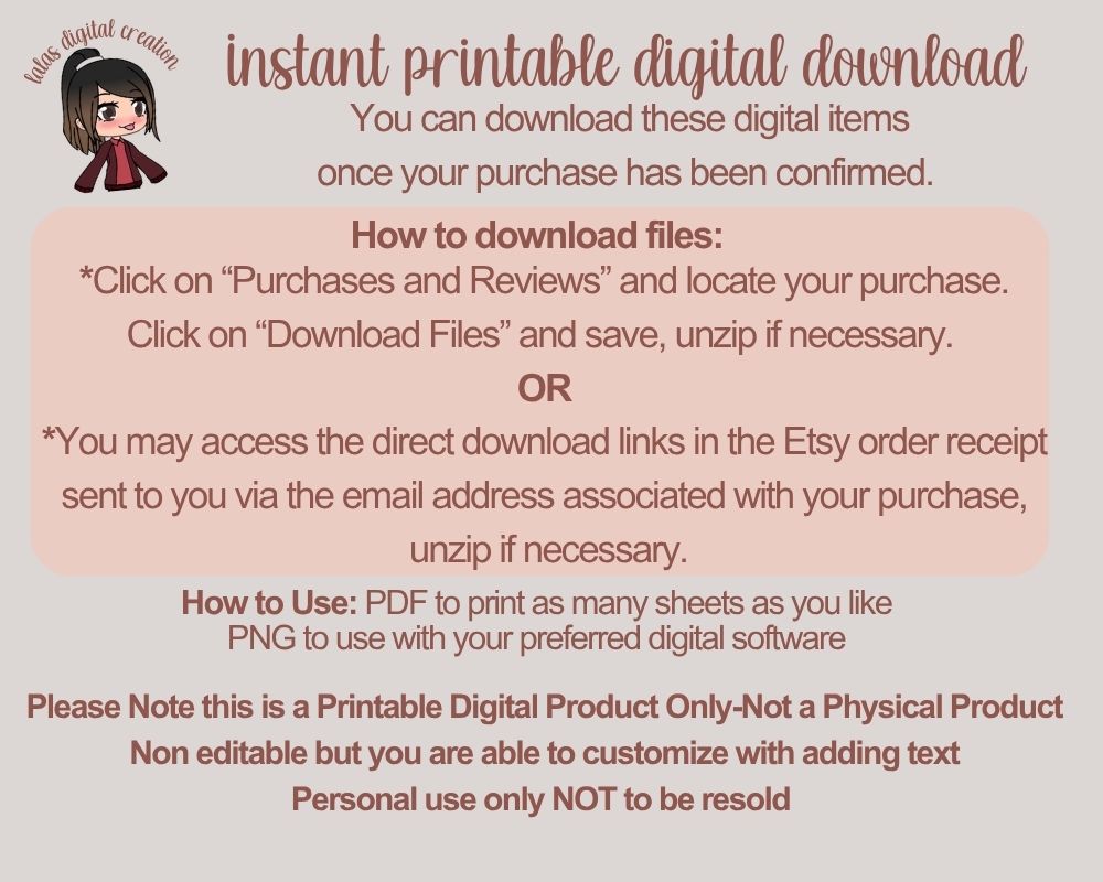 PLEASE NOTE: that printed colors might be slightly different depending on your computer screen/monitor/printer as colors vary from one computer monitor to another and color settings • For better printing results use the highest resolution possible and good quality paper or card stock paper.