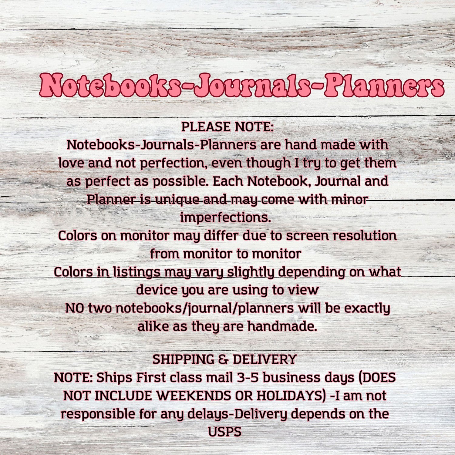 Notebooks-Journals-Planners are hand made with love and not perfection, even though I try to get them as perfect as possible. Each Notebook, Journal and Planner is unique and may come with minor imperfections.